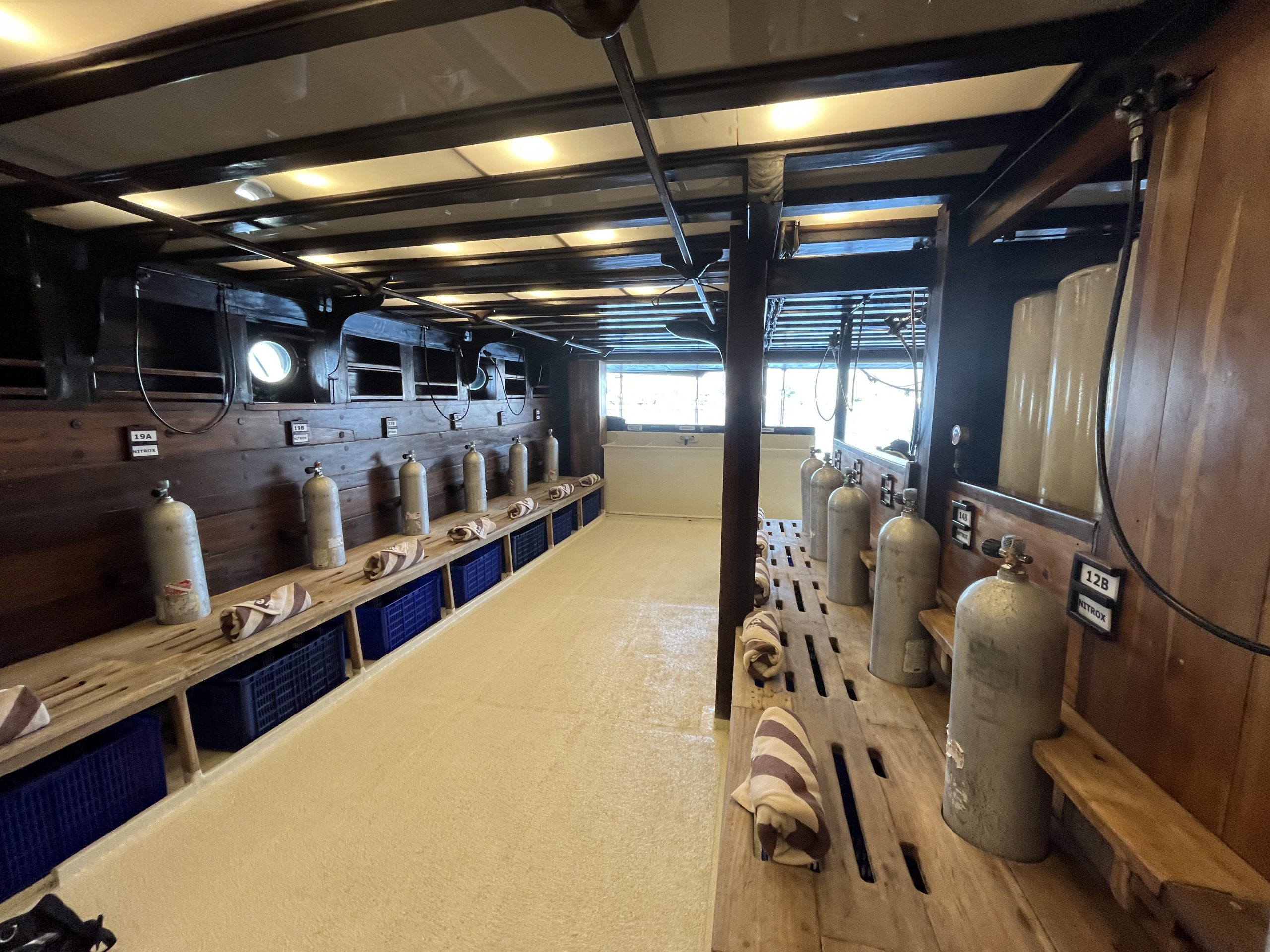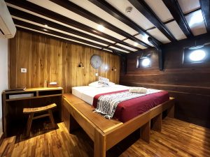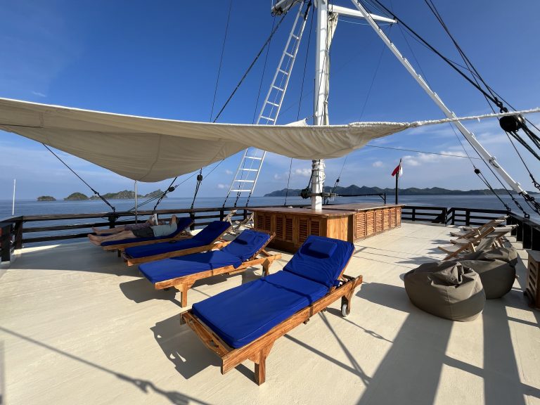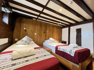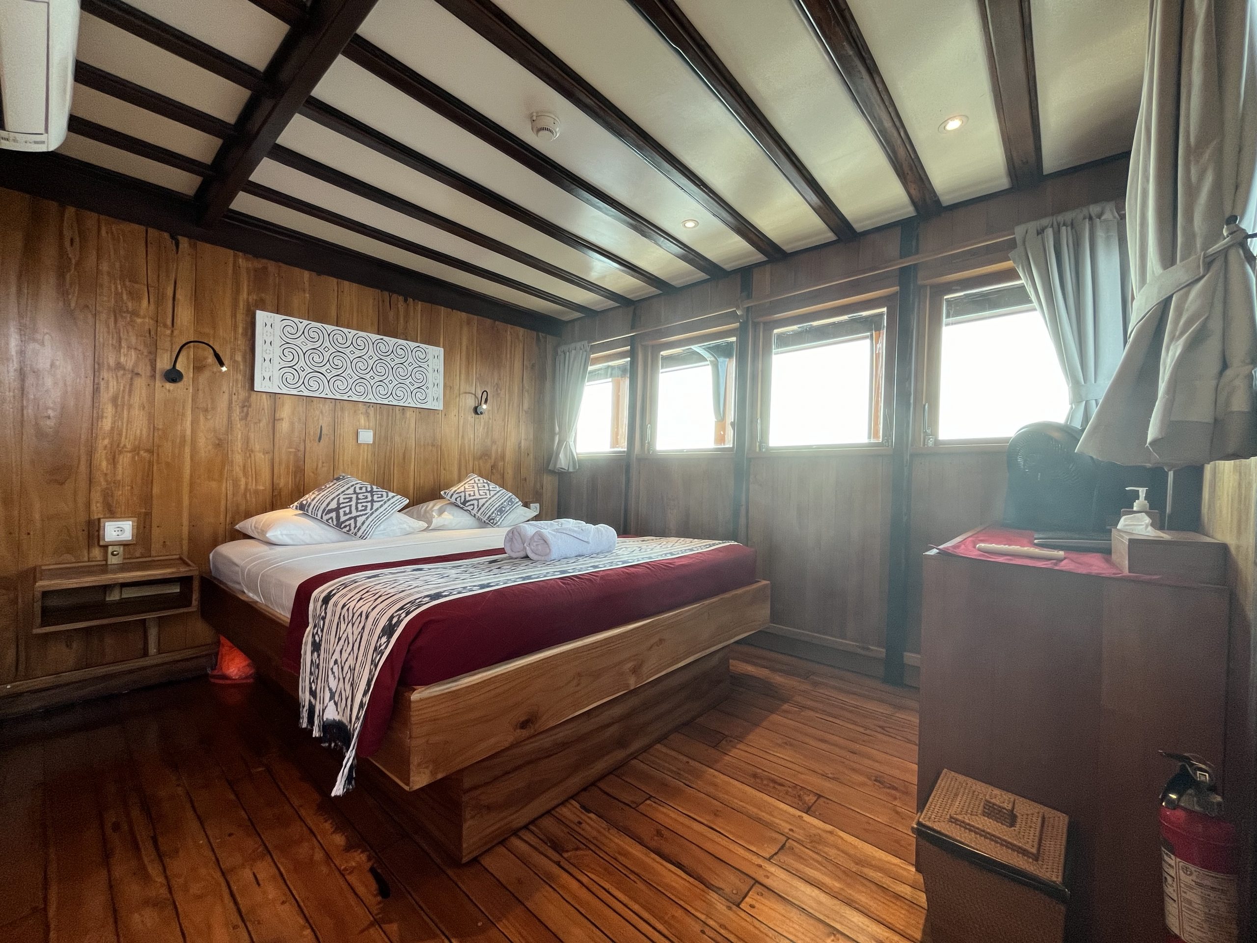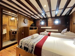 Decks & Kabinen SonnendeckDas 140 m² grosse Sonnendeck lädt zum Sonnen und Entspannen ein und bietet den besten Blick auf die einmalig schöne Wasser- und Inselwelt Indonesiens. Hier stehen unseren Gästen vielzählige Sonnenliegen, Strandstühle und Beanbags unter dem grossen Sonnensegel zur Verfügung. OberdeckAuf dem Oberdeck befinden sich 4 Gästekabinen (je 13 m²)mit privatem Badezimmer, mehreren Fenstern und individuell regelbarer Klimaanlage. Ebenfalls auf dem Oberdeck: das Steuerhaus, sowie ein Ruhebereich mit Liegestühlen. HauptdeckHier lädt eine komfortable, überdachte Aussen- Lounge zum Entspannen zwischen den Tauchgängen ein. Ebenfalls auf dem Hauptdeck: das Outdoor-Restaurant, sowie ein gemütlicher Aufenthaltsbereich im Innern. Unsere Bibliothek enthält Fachbücher zur Identifizierung von Fisch-Spezies und anderen Meereslebewesen, aber auch Belletristik. Zusätzlich befindet sich hier unsere Briefing Lounge, in der alle Tauch Briefings stattfinden. Das grosse Vorderdeck ist mit Liegestühlen ausgestattet und für heisse Tage mit einem Schattendach ausgerüstet. Wir essen meistens draussen, wenn es das Wetter erlaubt. UnterdeckHier befinden sich 5 Doppel/Twin Kabinen (je 14 m²) sowie 2 Einzelkabinen für Alleinreisende. Alle Kabinen haben ihr privates Badezimmer, Bullaugen sowie individuell regelbarer Klimaanlage. Auf dem geräumigen designiertem Tauchdeck hat jeder Gast seinen individuellen Platz für die Ausrüstung. Das Equipment bleibt wärend der gesamten Tour am Platz und ist jederzeit zugänglich. Von hier aus ist der Kameraraum direkt zugänglich somit man sich um seine Fotos an unserem 9 Meter langen Kameratisch kümmern kann. Ausgestattet mit internationalen Steckdosen und Verlängerungskabeln, sowie Lampen und Ventilatoren macht dies den perfekten Platz für unsere Fotografen. Die Kabinen Für 20 Gäste stehen insgesamt 9 Doppelkabinen und 2 Einzelkabinen zur Verfügung. Alle unsere Doppelkabinen können mit 1 Doppelbett oder 2 Einzelbetten ausgestattet werden. 5 Doppelkabinen (14m²) sowie 2 Einzelkabinen (11m²) befinden sich im Unterdeck, 4 Doppelkabinen (13m²) im Oberdeck. Alle Kabinen mit individuell regelbarer Klimaanlage, Ventilator und privatem Badezimmer mit Warmwasserdusche.