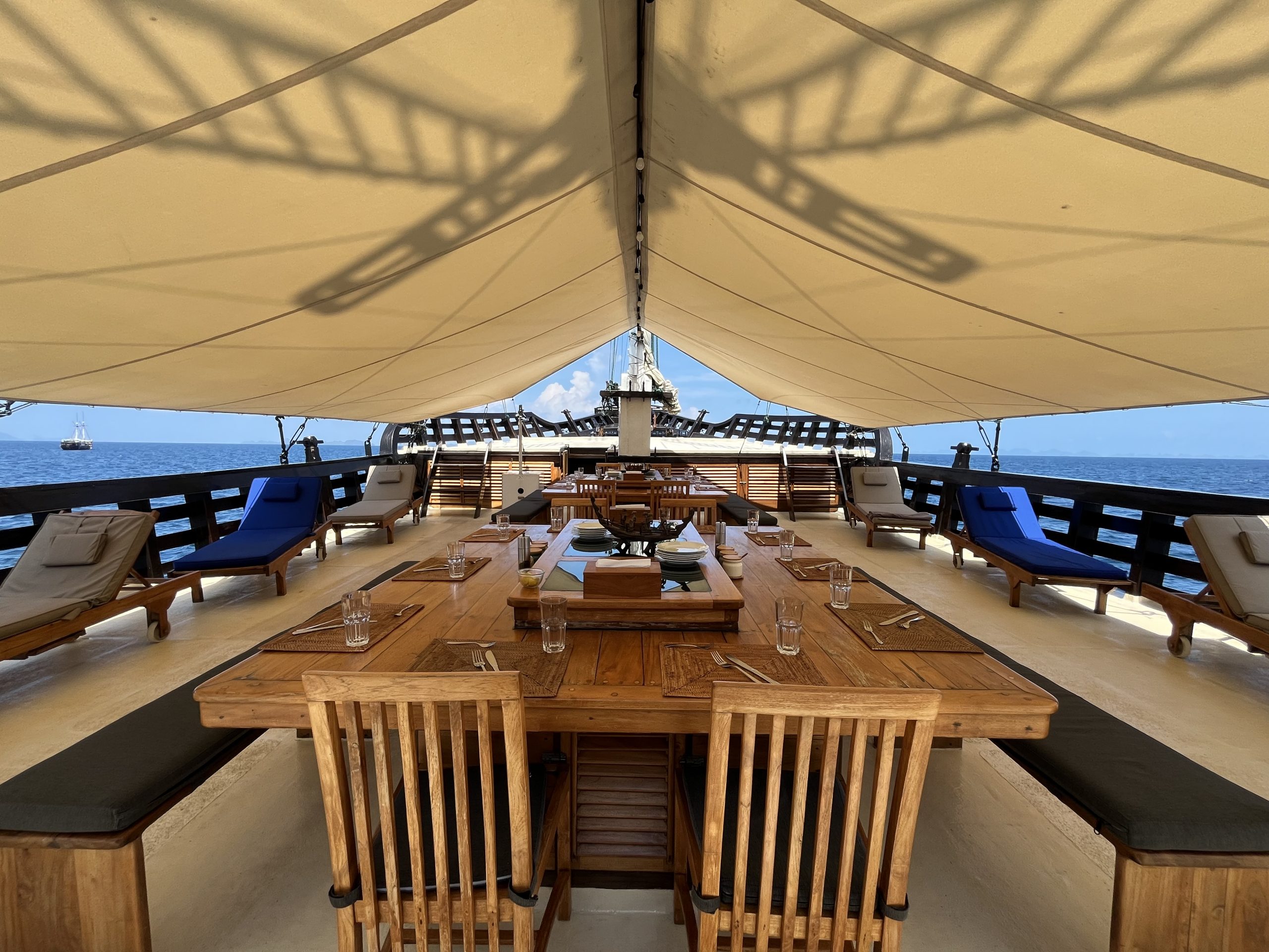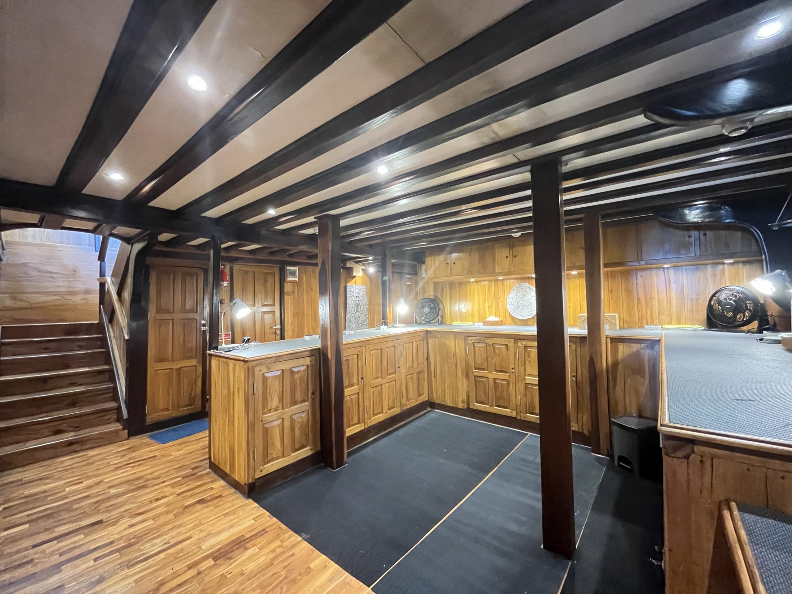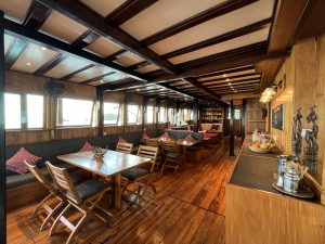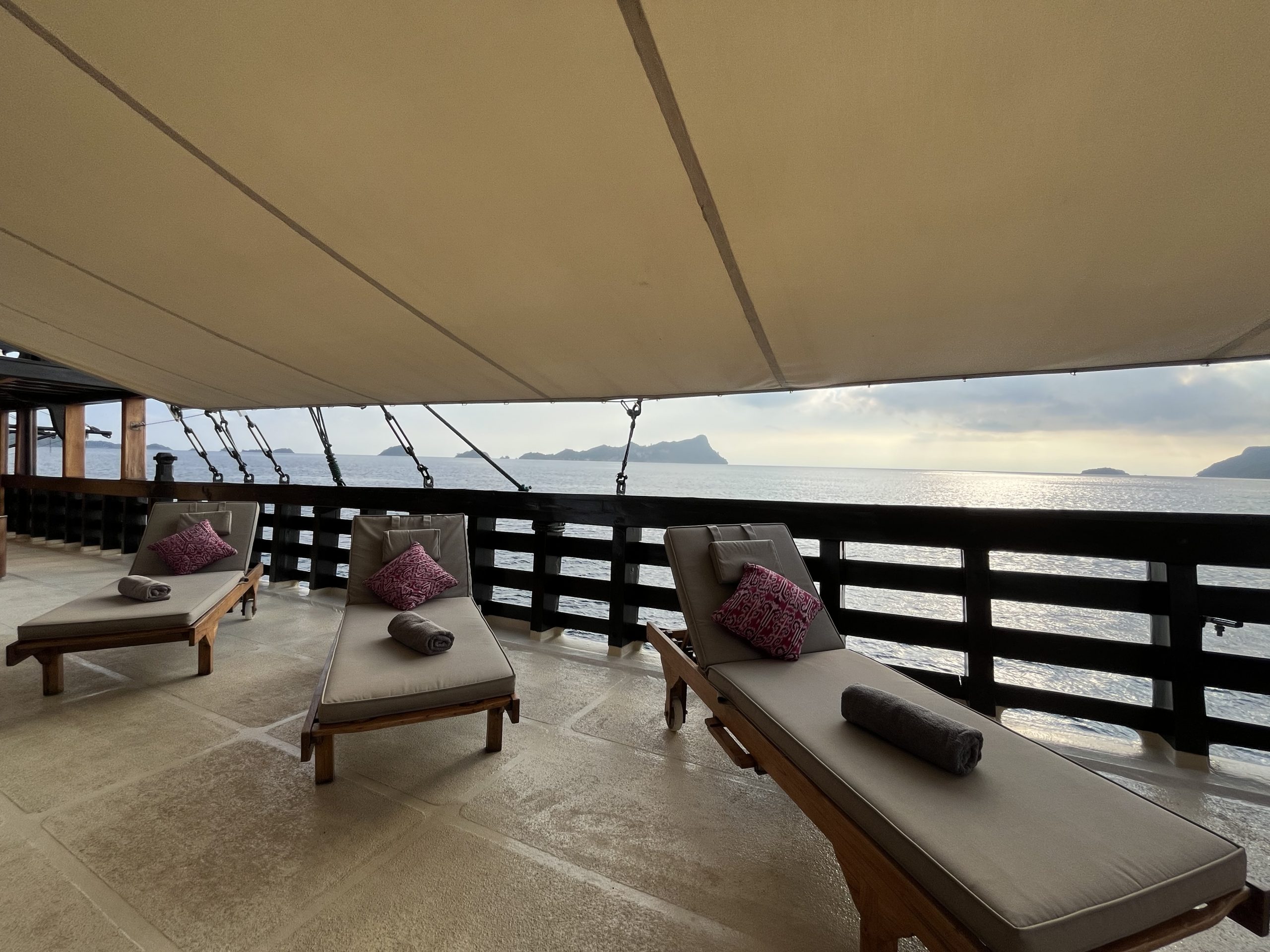 Decks & Kabinen SonnendeckDas 140 m² grosse Sonnendeck lädt zum Sonnen und Entspannen ein und bietet den besten Blick auf die einmalig schöne Wasser- und Inselwelt Indonesiens. Hier stehen unseren Gästen vielzählige Sonnenliegen, Strandstühle und Beanbags unter dem grossen Sonnensegel zur Verfügung. OberdeckAuf dem Oberdeck befinden sich 4 Gästekabinen (je 13 m²)mit privatem Badezimmer, mehreren Fenstern und individuell regelbarer Klimaanlage. Ebenfalls auf dem Oberdeck: das Steuerhaus, sowie ein Ruhebereich mit Liegestühlen. HauptdeckHier lädt eine komfortable, überdachte Aussen- Lounge zum Entspannen zwischen den Tauchgängen ein. Ebenfalls auf dem Hauptdeck: das Outdoor-Restaurant, sowie ein gemütlicher Aufenthaltsbereich im Innern. Unsere Bibliothek enthält Fachbücher zur Identifizierung von Fisch-Spezies und anderen Meereslebewesen, aber auch Belletristik. Zusätzlich befindet sich hier unsere Briefing Lounge, in der alle Tauch Briefings stattfinden. Das grosse Vorderdeck ist mit Liegestühlen ausgestattet und für heisse Tage mit einem Schattendach ausgerüstet. Wir essen meistens draussen, wenn es das Wetter erlaubt. UnterdeckHier befinden sich 5 Doppel/Twin Kabinen (je 14 m²) sowie 2 Einzelkabinen für Alleinreisende. Alle Kabinen haben ihr privates Badezimmer, Bullaugen sowie individuell regelbarer Klimaanlage. Auf dem geräumigen designiertem Tauchdeck hat jeder Gast seinen individuellen Platz für die Ausrüstung. Das Equipment bleibt wärend der gesamten Tour am Platz und ist jederzeit zugänglich. Von hier aus ist der Kameraraum direkt zugänglich somit man sich um seine Fotos an unserem 9 Meter langen Kameratisch kümmern kann. Ausgestattet mit internationalen Steckdosen und Verlängerungskabeln, sowie Lampen und Ventilatoren macht dies den perfekten Platz für unsere Fotografen. Die Kabinen Für 20 Gäste stehen insgesamt 9 Doppelkabinen und 2 Einzelkabinen zur Verfügung. Alle unsere Doppelkabinen können mit 1 Doppelbett oder 2 Einzelbetten ausgestattet werden. 5 Doppelkabinen (14m²) sowie 2 Einzelkabinen (11m²) befinden sich im Unterdeck, 4 Doppelkabinen (13m²) im Oberdeck. Alle Kabinen mit individuell regelbarer Klimaanlage, Ventilator und privatem Badezimmer mit Warmwasserdusche.